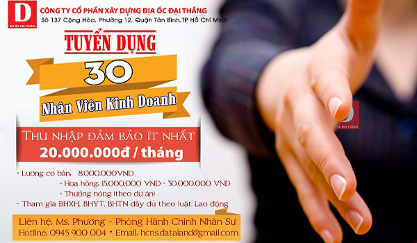 Do nhu cầu mở rộng quy mô công ty, phát triển thị trường: Đất nền dự án Hot Đông Sài Gòn. Công ty Đại Thắng cần tuyển 20 nhân viên kinh doanh BĐS ( Lương cứng cao + Hoa hồng hấp dẫn)
