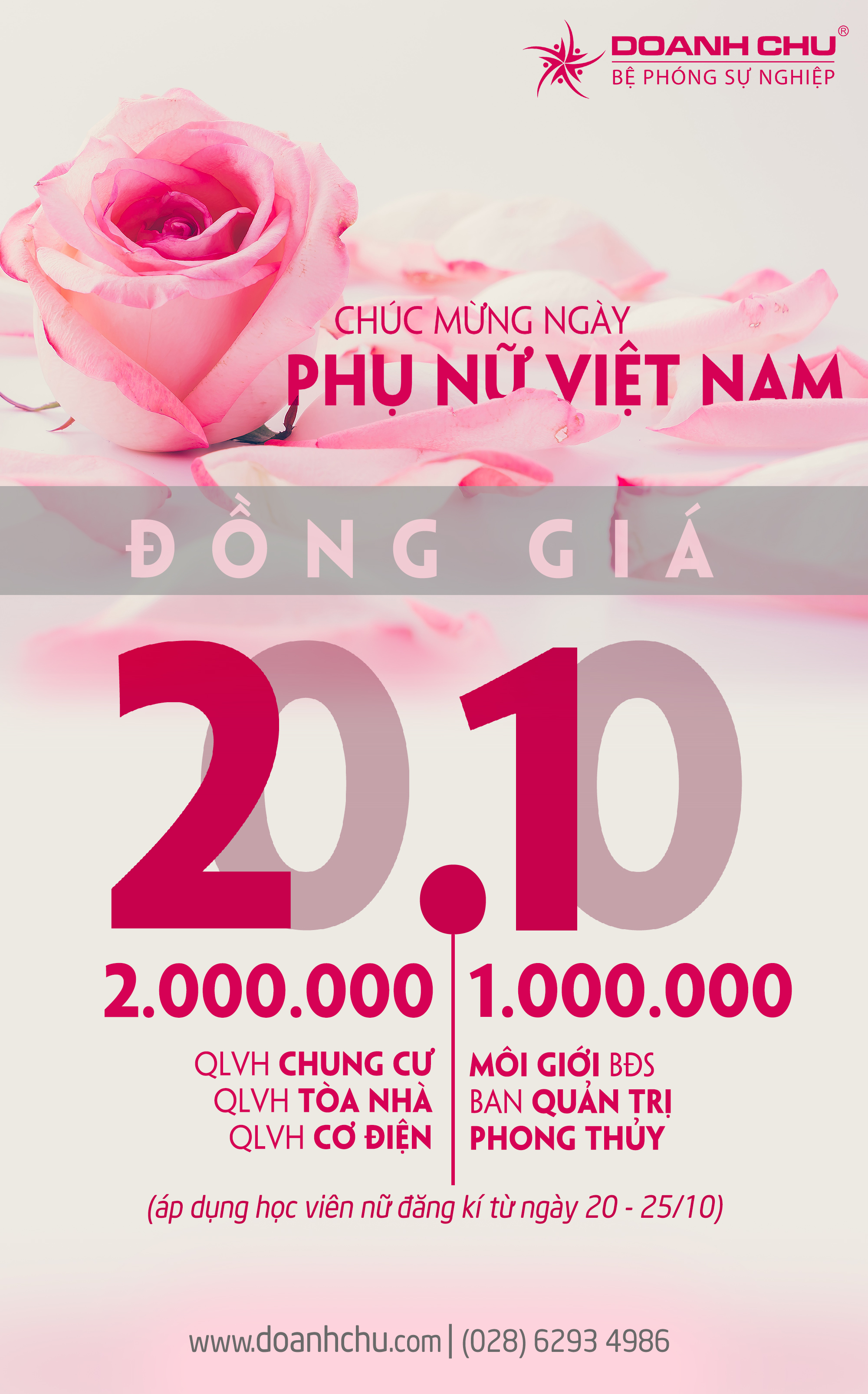 Nhân dịp đặc biệt 20/10 sao không dành cho người phụ nữ yêu thương một món quà siêu lợi nhuận đó chính là kiến thức. Viện Doanh Chủ dành tặng cho chị em rất nhiều khóa học với mức học phí ưu đãi bất ngờ: