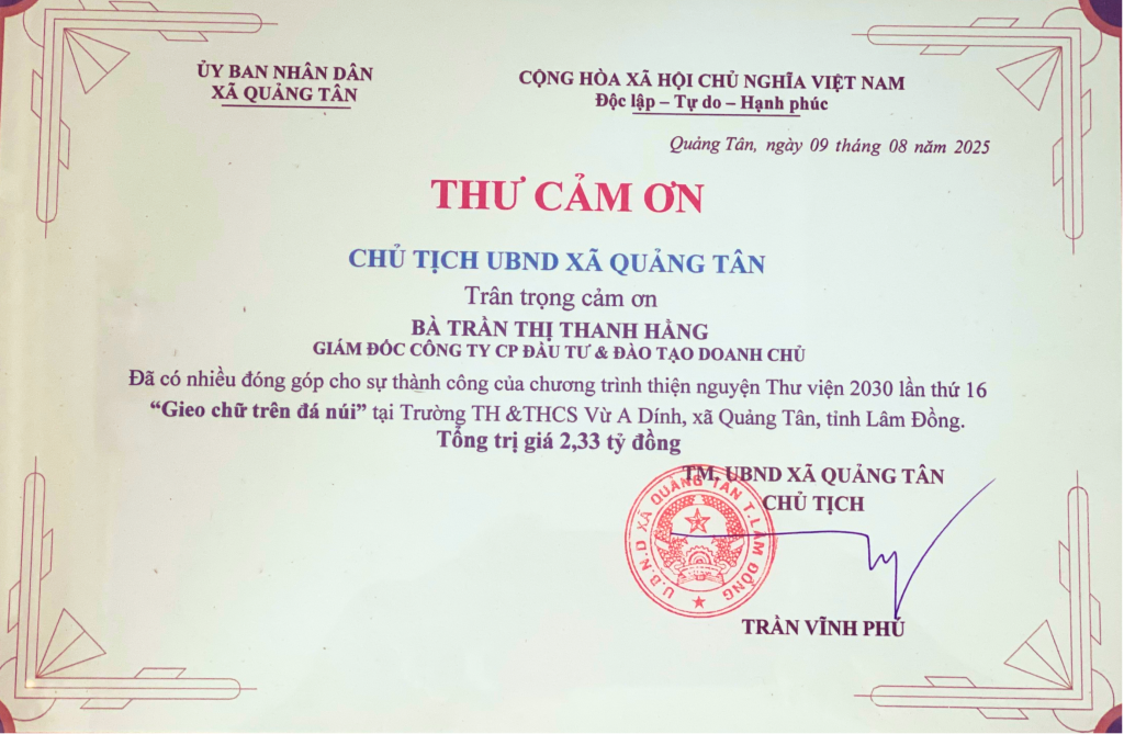 Trong vai trò Trưởng ban Tổ chức Chương trình Caravan Thư viện 2030 lần thứ 16, Chủ tịch HĐQT Viện Đào tạo Doanh Chủ – nguyên Chủ tịch CLB Doanh Nhân 2030 nhiệm kỳ 9 – đã cùng cộng đồng doanh nhân thực hiện hành trình ý nghĩa mang tên “Gieo chữ trên đá núi”.