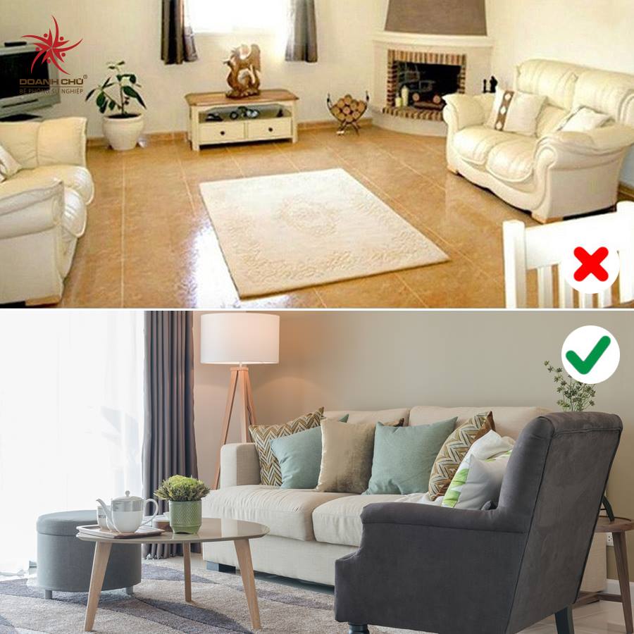 Đồ nội thất trong phòng khách cần phù hợp về tỷ lệ với không gian. Tuyệt đối không nên để đồ nội thất chắn cửa và nên đặt ghế sofa chính dựa vào tường để mang lại sự trợ giúp cho gia chủ.